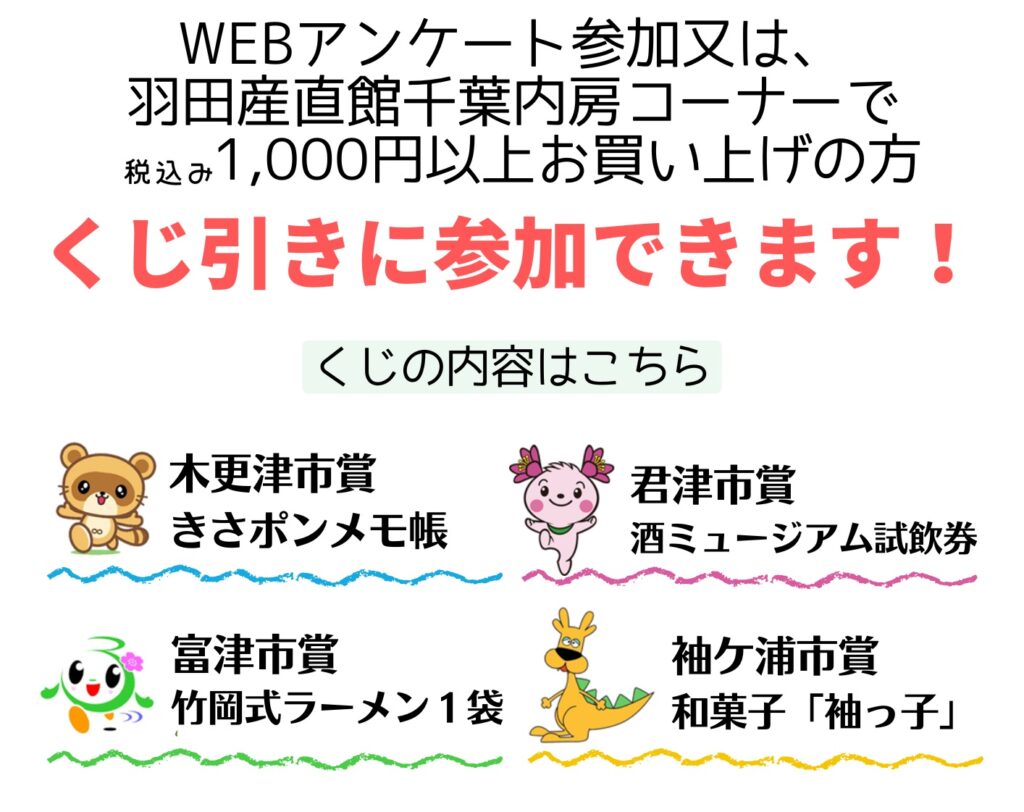 イベントでは千葉内房の観光PRや特産品を販売。またプレゼント企画も実施。この機会にぜひ羽田産直館にお越しいただき、羽田空港からもアクセス抜群の千葉内房の魅力に触れてください。